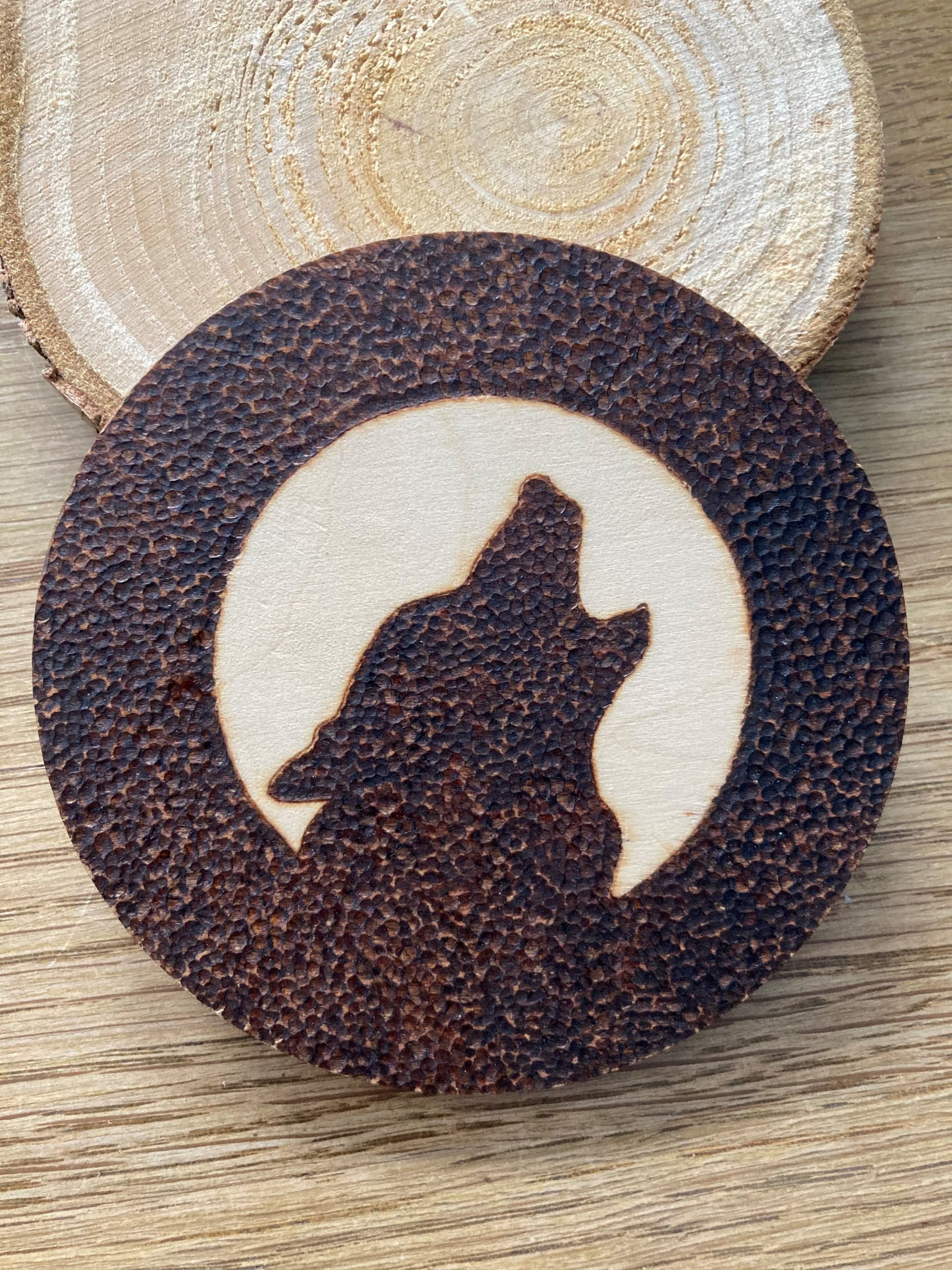 The wooden coaster has been handcrafted with a pyrographed wolf design – each one is unique (not mass produced)